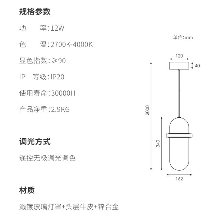 美时吊灯灵感源自早晨的光线,,穿透云雾渺渺的大气层洒到地上。。美时外层的玻璃自上而下从深色到透明的渐变镀层还原了这一情境,,,,光透过双层玻璃形成丰富的折射效果,,,一如破晓时的光线充满朝气,,,采用上下两路光组合,,,,下路光直出提供主要光线,,,,上路光提供氛围光。。。上路光在手工吹制玻璃的不规则壁厚折射下,,,,呈现了极其丰富的变化,,,采用头层牛皮作为一个点缀,,缓冲了玻璃与金属带来的冰冷和生硬的感觉,,取得了视觉的平衡。。