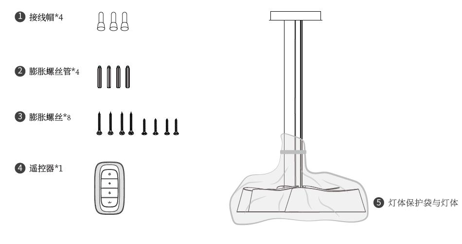 膨胀螺丝*4;膨胀塑料管*4;接线帽*4;遥控器*1(遥控版本);灯体*1;