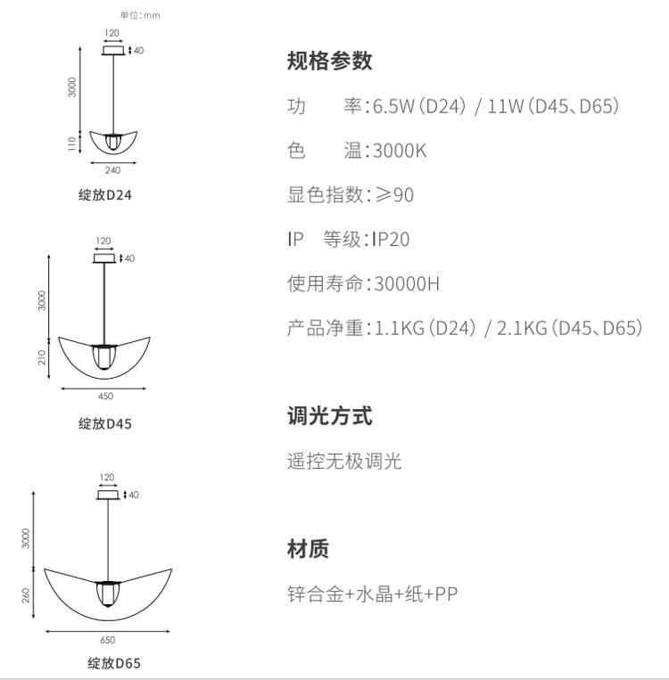 利用材料物理弹性,,透过巧妙的结构,,,,灯罩在空间里呈现一个富有张力和生机的曲面,,,,仿佛在空间里热烈绽放的花朵,,,,灯罩表面采用手工敷纸工艺,,更加的朦胧舒适,,纸纤维的材质也让灯光更加温柔。。选用实心高级无铅水晶材质,,,这种材料洁净无瑕的透明度与低色散特性,,,硬度高,,,多用于精密光学器件及高端水晶制品,,更好展现丰富光影质感。。。